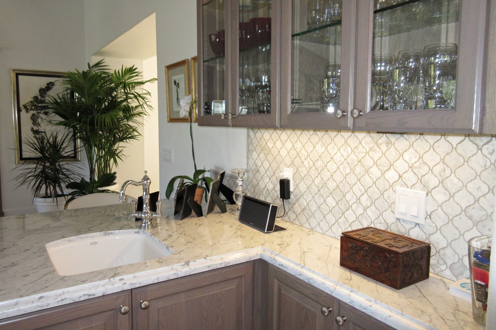 Transitional Carrera Marble Countertop Arabesque Backsplash