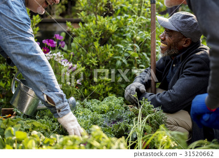 Group Of People Gardening Backyard Together Stock Photo