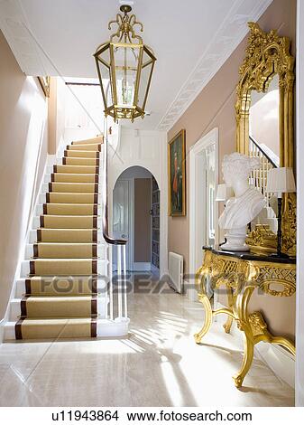 Brass And Glass Lantern In Hall With Beige Carpet On Staircase