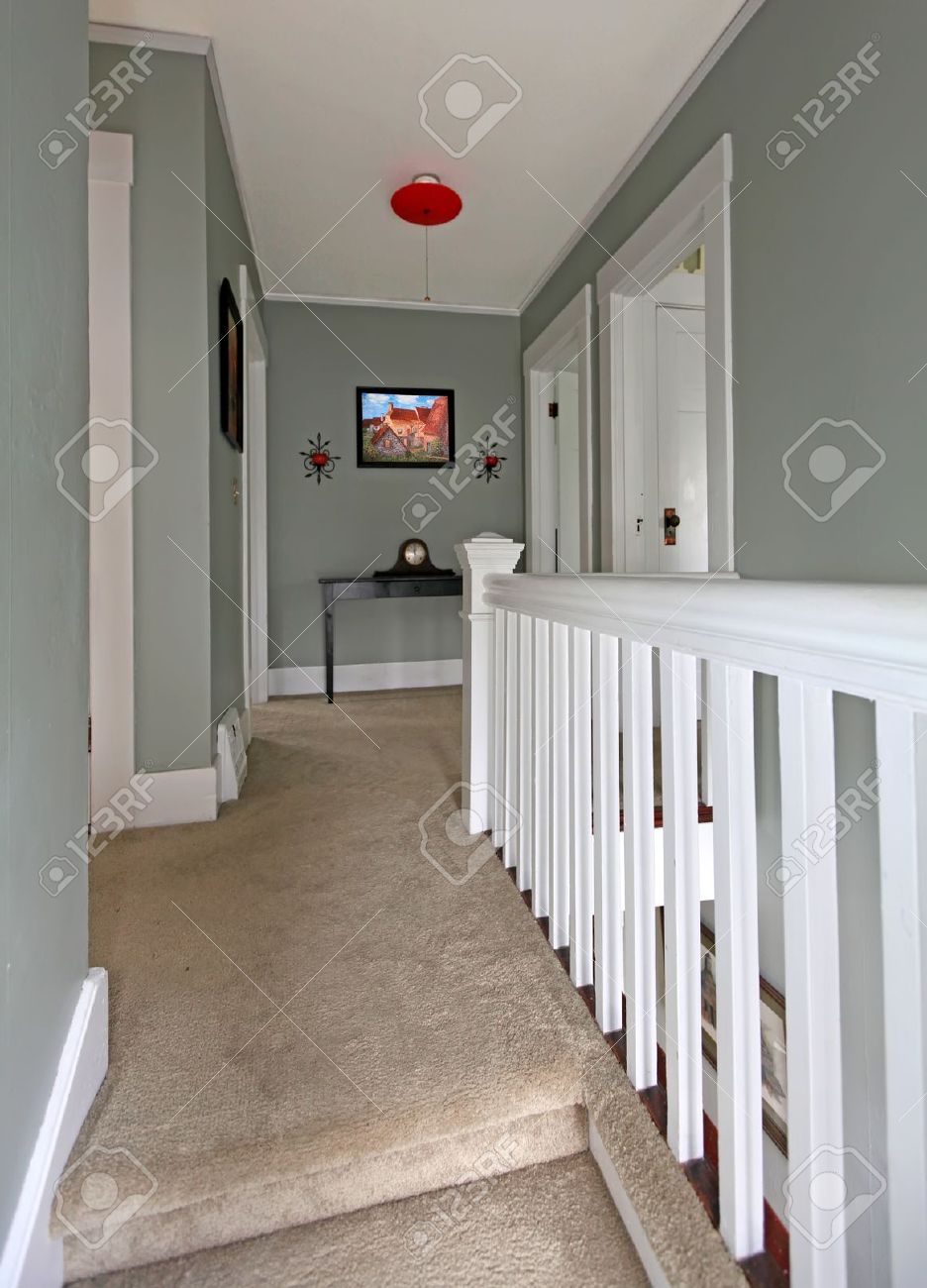 Grey Upstairs Hallway With White Railing And Beige Carpet Stock