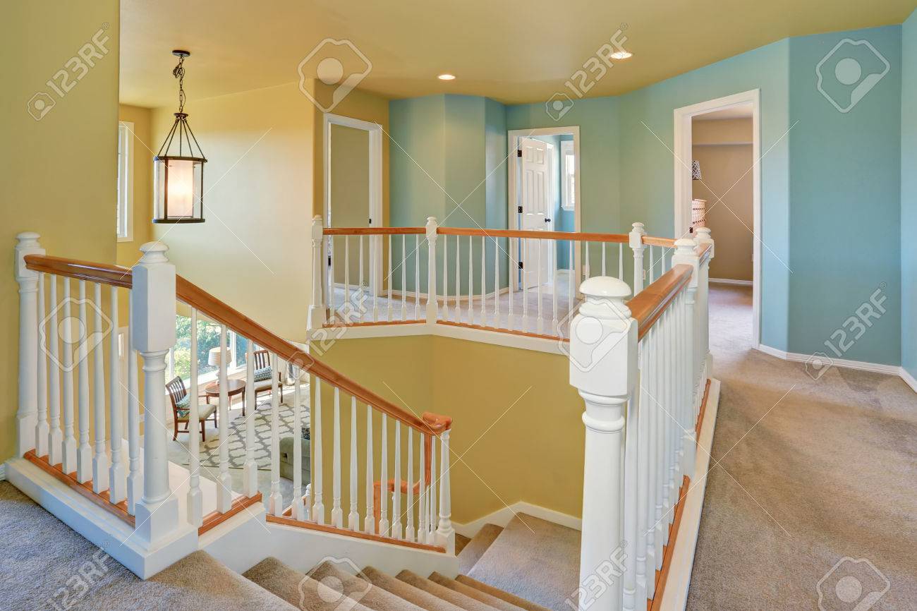Hallway Interior With Blue And Yellow Walls Staircase With White