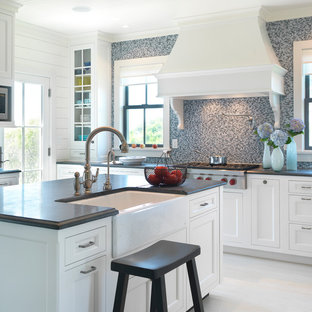 Dishy Blue Mosaic Tile Backsplash Kitchen Transitional With Navy Cabinets Aluminum Hood Brass Stools And Freestanding Half Circle Island Behind