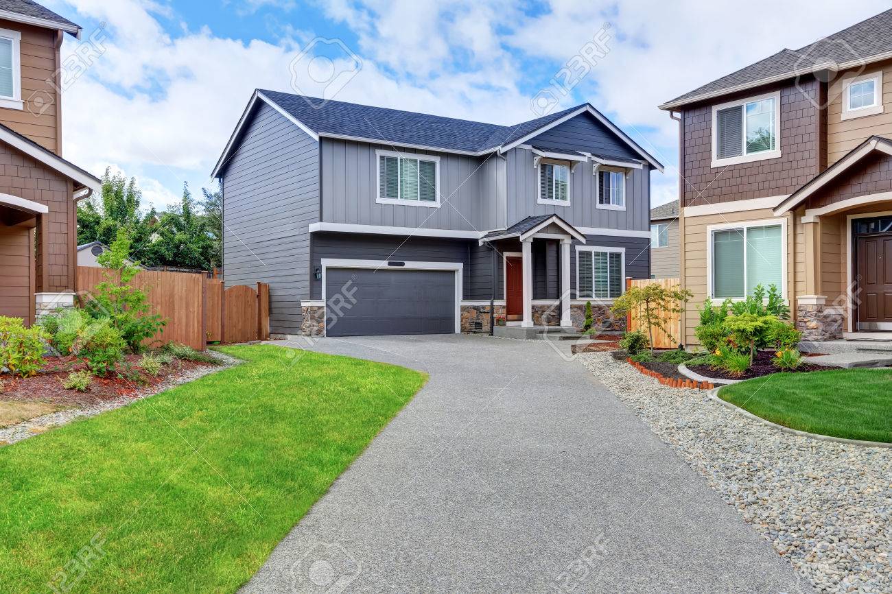 Gray House Exterior With Dark Blue Roof And Long Driveway Tacoma