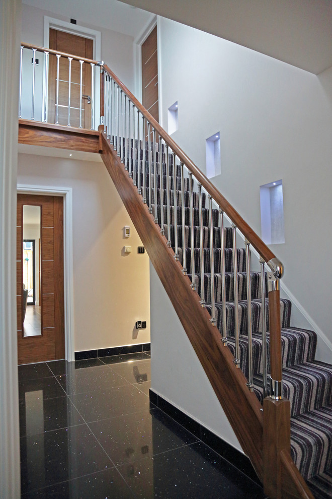 Walnut Staircase With Chrome Spindles And Recesses In Wall