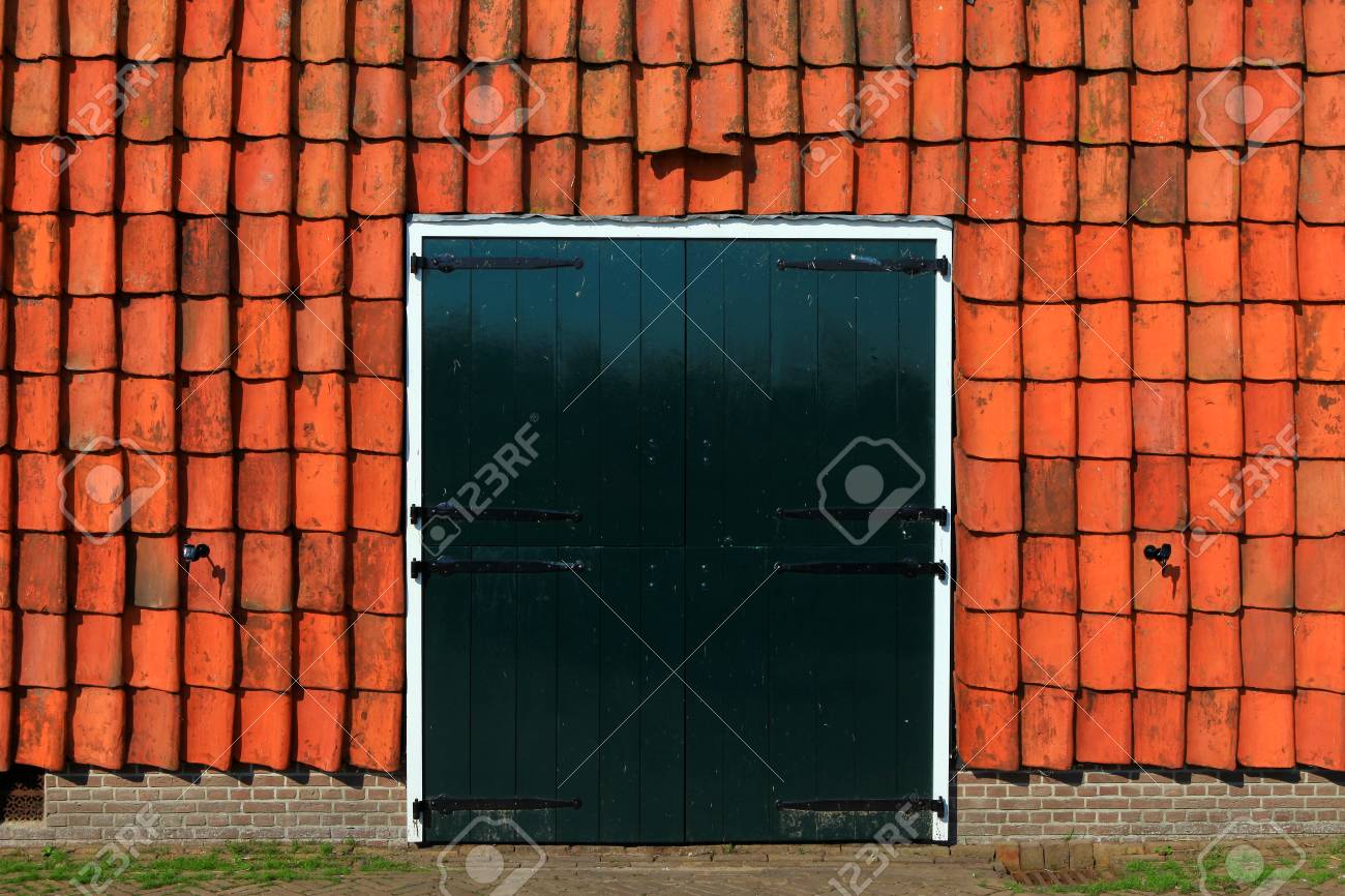 Dark Green Barn Doors With Red Roof Tiles Stock Photo Picture And