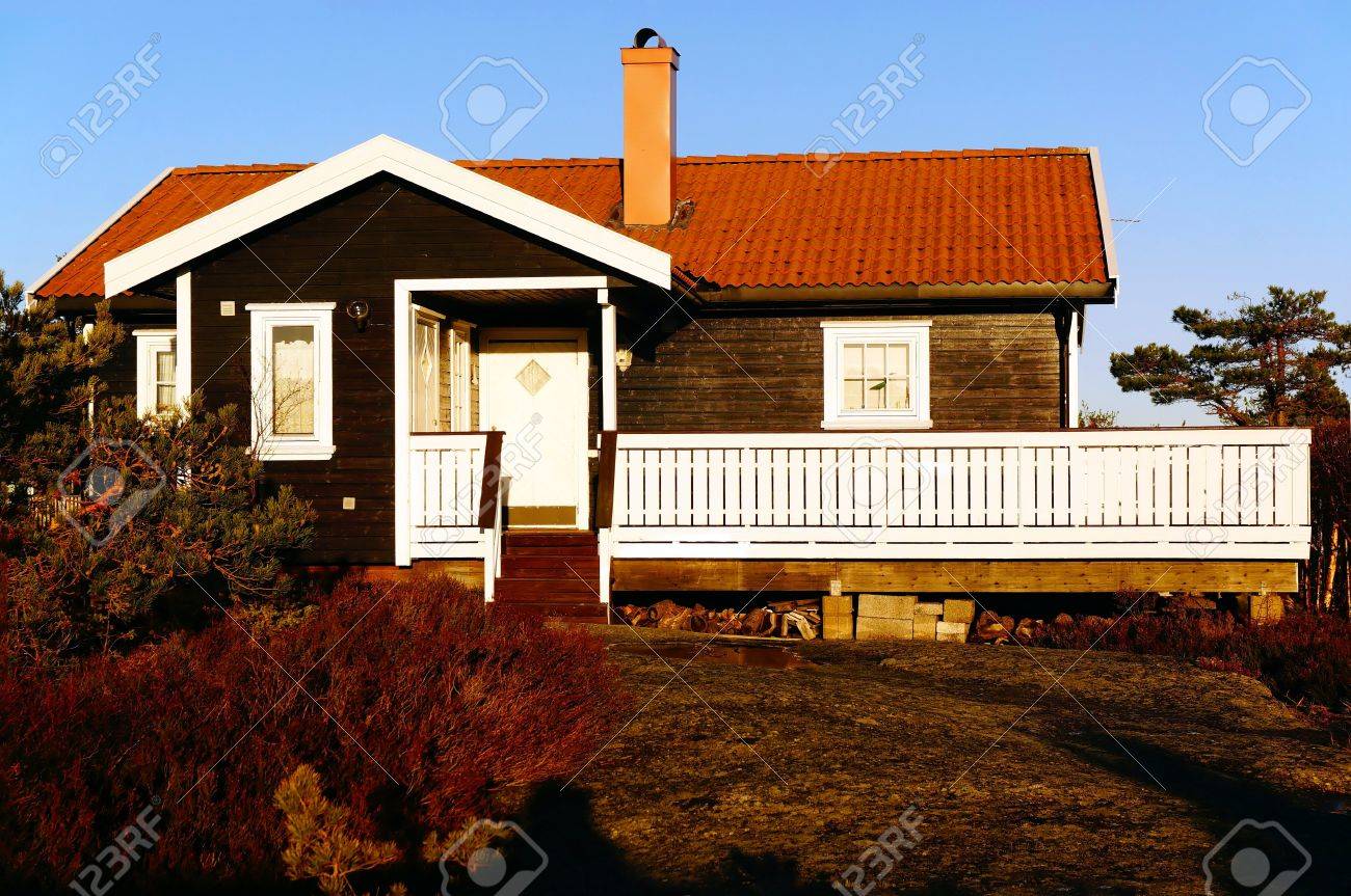 Cute Old Wooden House In Light Blue With Red Roof Tiles Stock