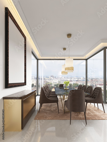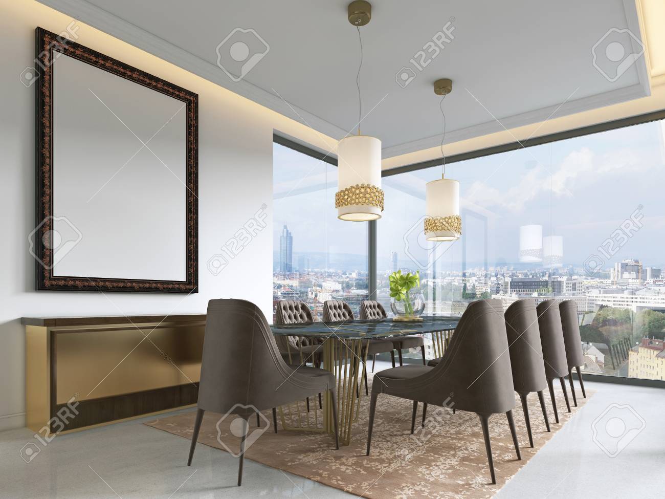 Modern Dining Room With Hanging Lamps On There Are Chairs And