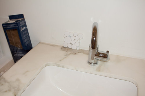 Faux White Marble Epoxy Countertop With Subway Tile Backsplash