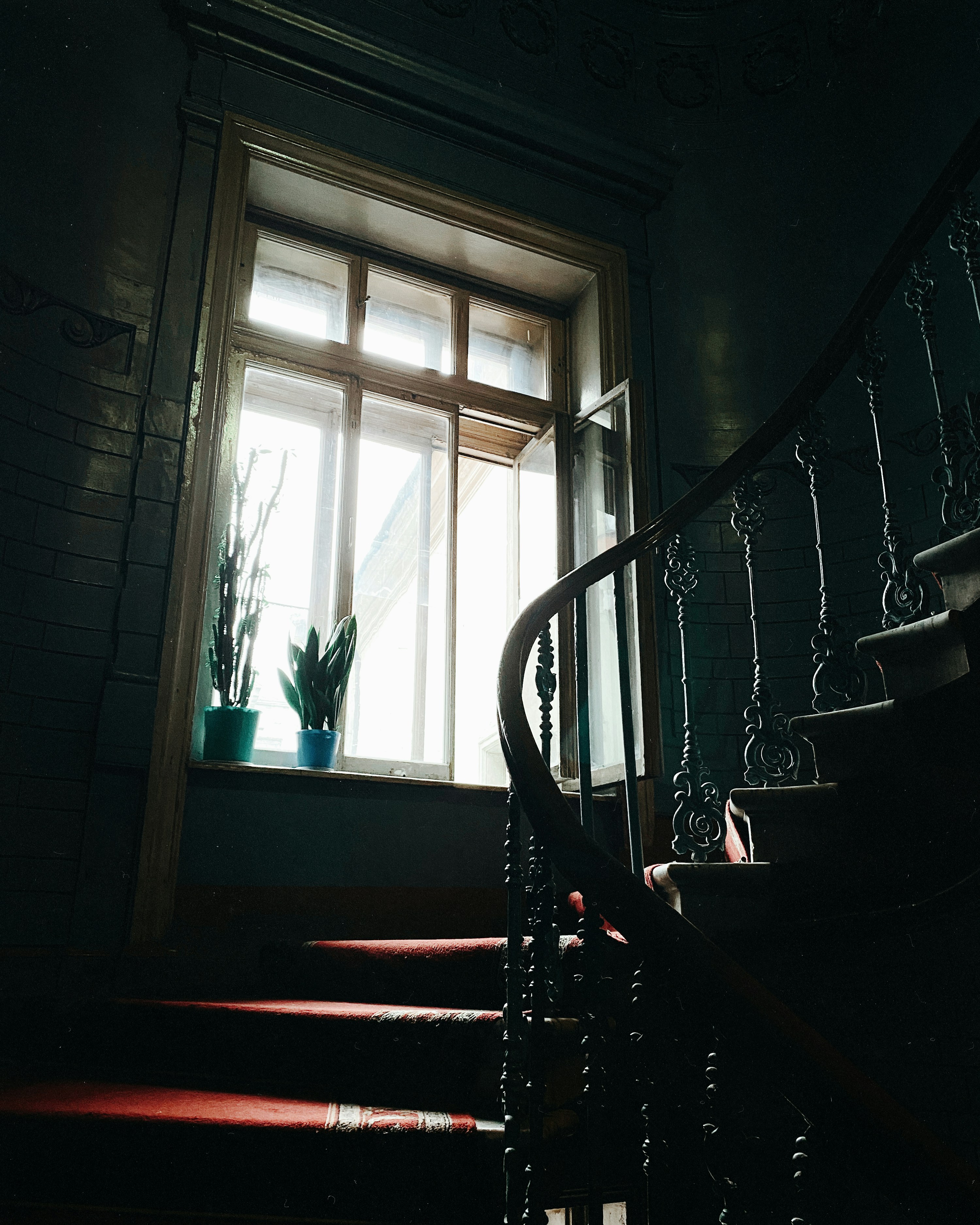 Black Spiral Staircase Near Brown Wooden Framed Glass Window Photo