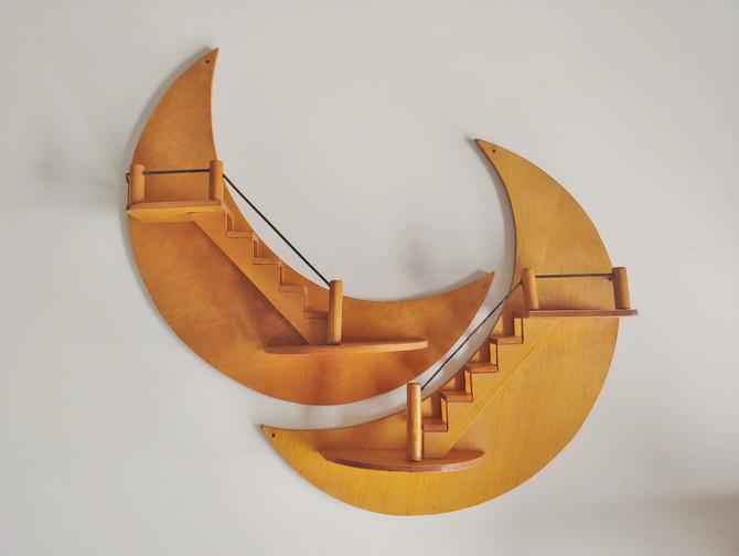 Vtg Wood Half Moon Star Knick Knack Wall Shelf With Steps Mid