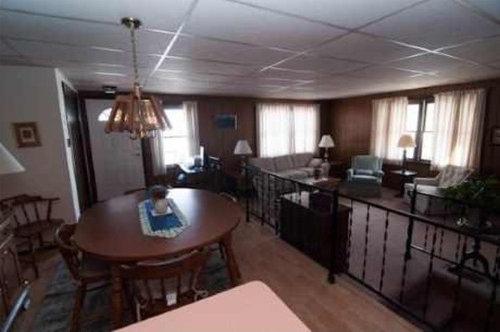 Half Wall Echos Adjacent Kitchen Shelving Open Basement Stairs