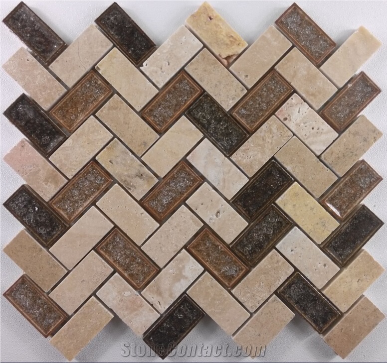 Mixed Quartz Herringbone Stone Mosaic Tile Travertine Backsplash