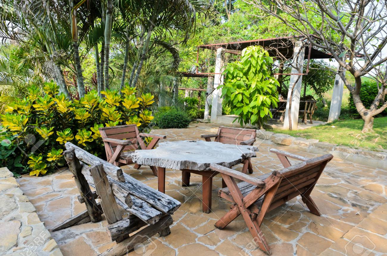 Holztisch Und Stuhlen Im Garten Lizenzfreie Fotos Bilder Und