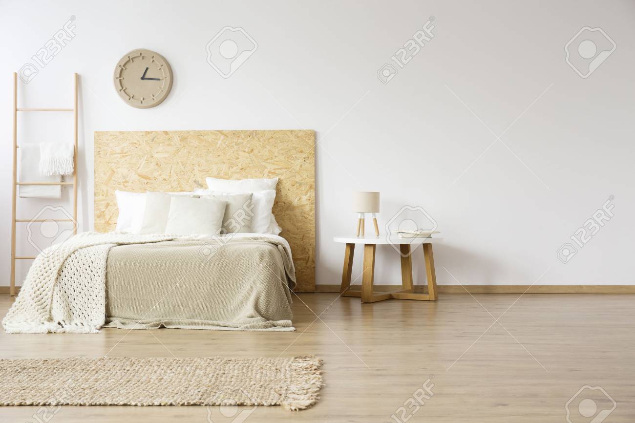 Holzerne Lampe Und Leiter Nahe Bett Im Naturlichen Schlafzimmer