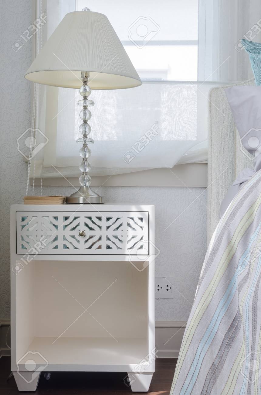 Klassische Lampe Auf Weissen Tisch Im Luxuriosen Schlafzimmer Zu