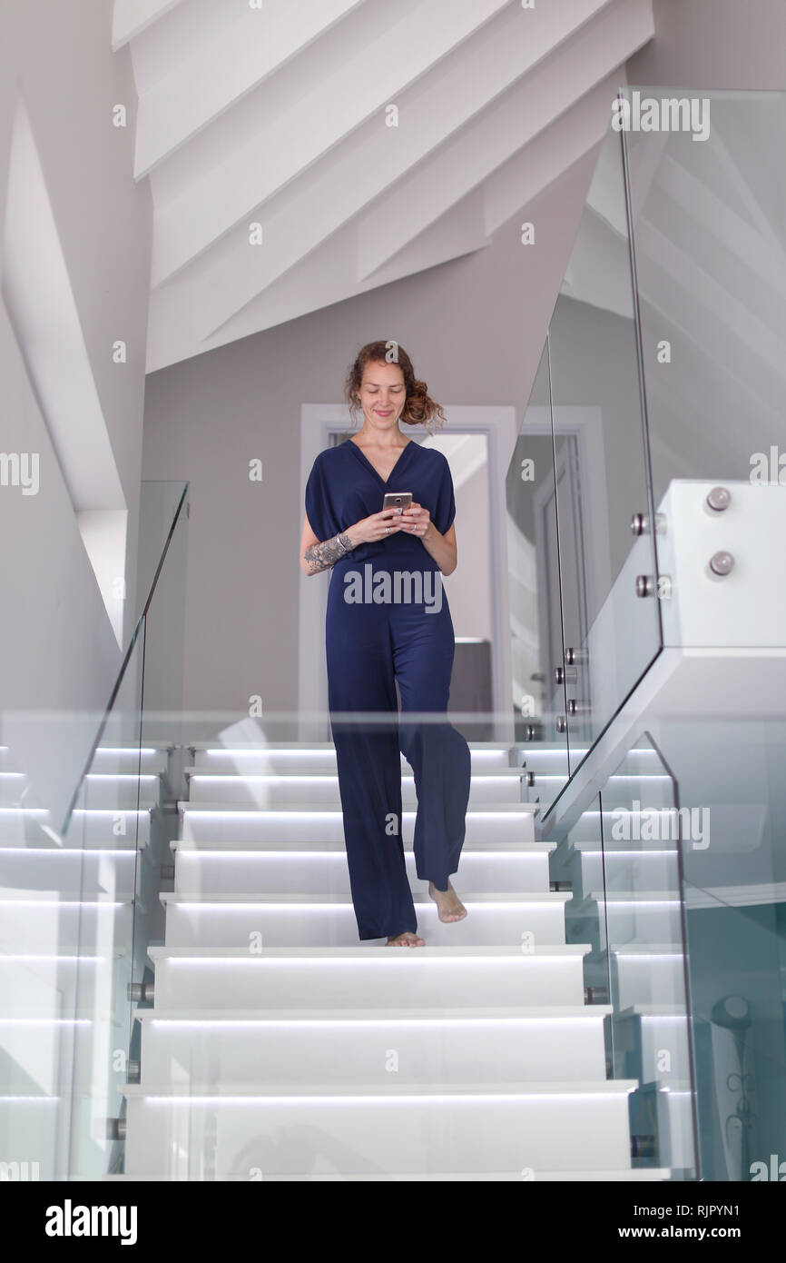Young Woman Coming Down Modern Stairway Looking At Smartphone