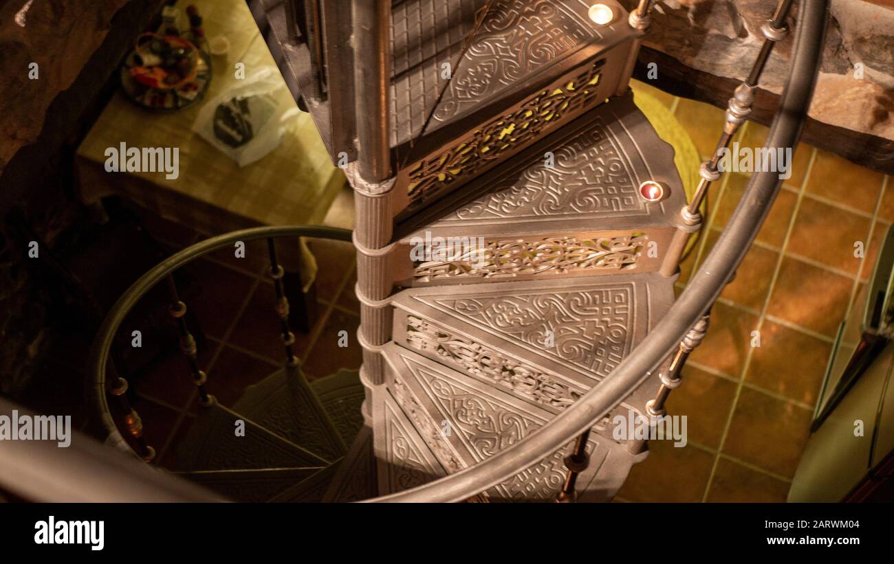 A High Angle Shot Of A Spiral Narrow Staircase With Gothic Design