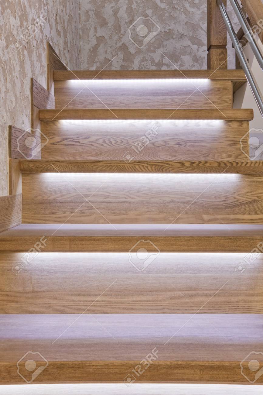 Steps Of Oak Staircase With Led Backlight Stock Photo Picture And