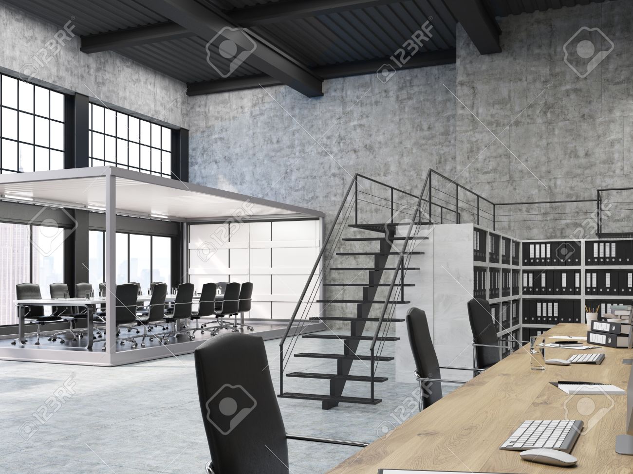 Aquarium Board Room In Open Office With Stairs And Row Of