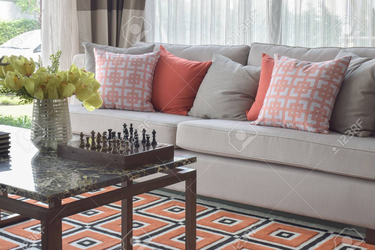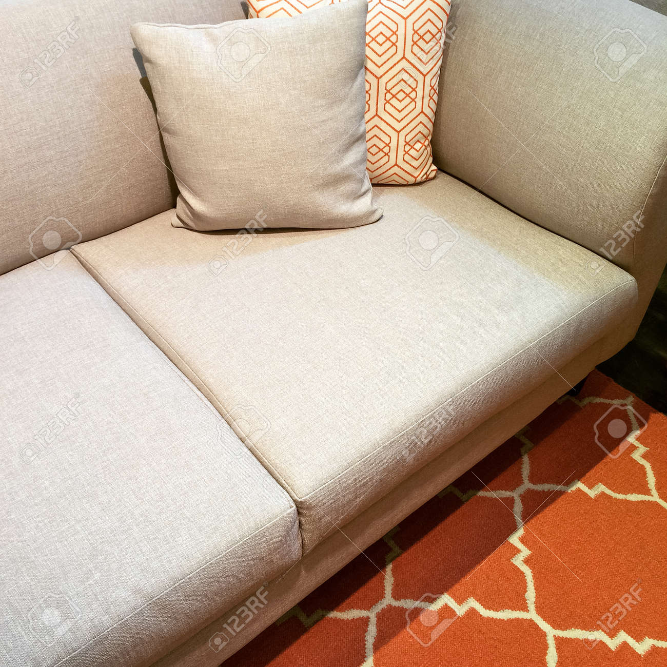 Comfortable Gray Sofa With Cushions On Orange Carpet Stock Photo
