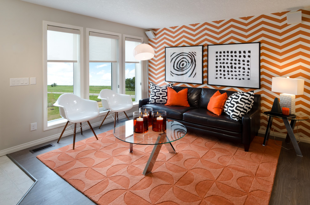 Graphic Orange Scheme Pillows And Graphic Orange Carpet In Living