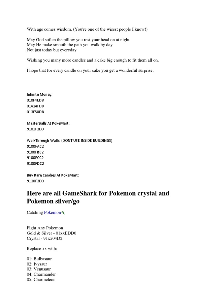 Pokemon Crystal Cheats Gameshark Codes For Gameboy And Gbc