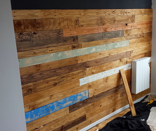 Reclaimed Colourful Pallets And Floorboards Wall Rustic Dining