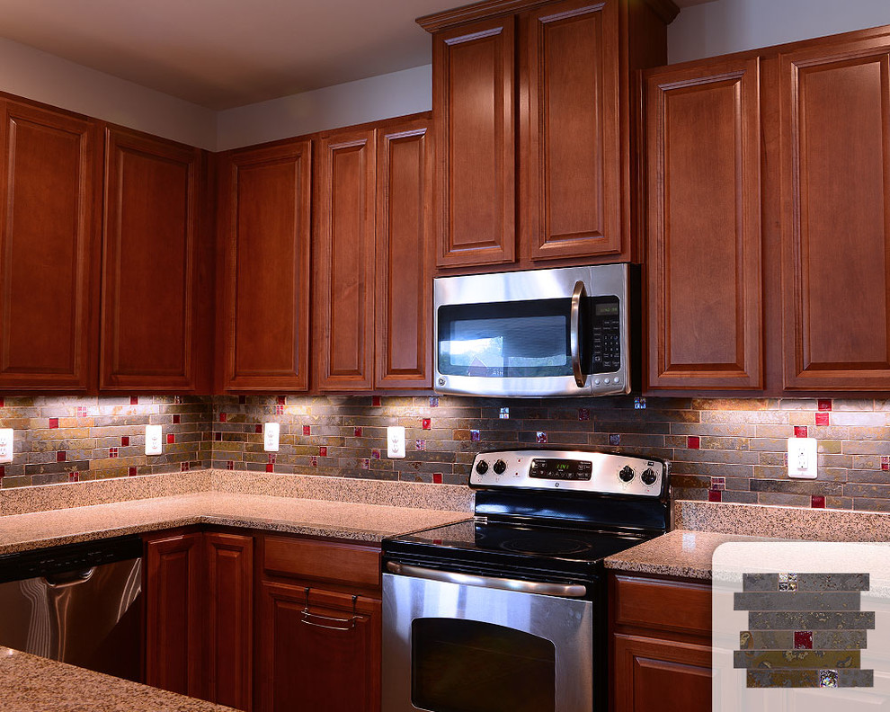 Ba1046 Rusty Brown Color Slate Tile With Red Glass Backsplash Tile From Backsplash Com Slate Backsplash Tile Backsplash Colorful Backsplash