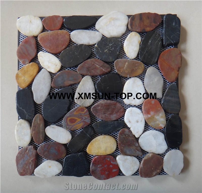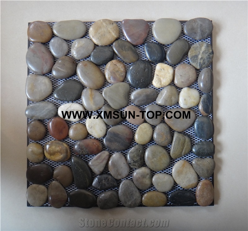 Mixed Color Honed Flat Pebble Mosaic In Mesh Natural River Stone