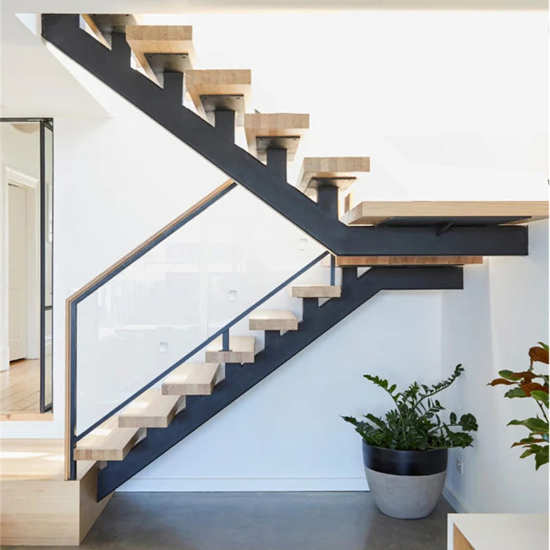 Modern Single Stringer Straight Steel Staircase With Solid Wood Tread