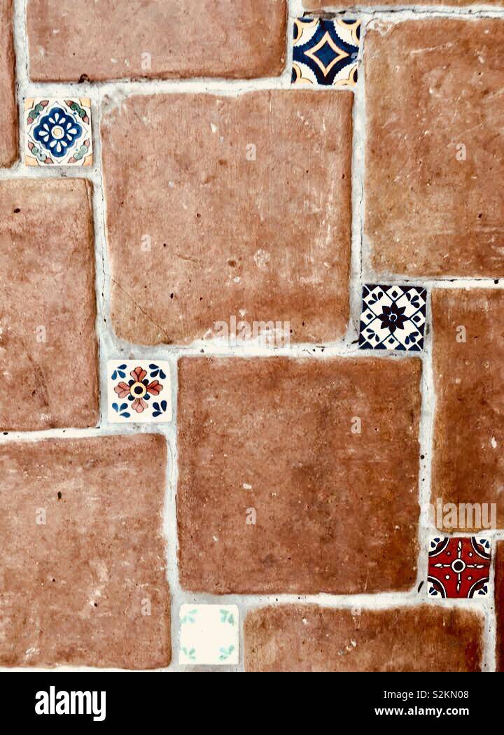 Terracotta flagstones interspersed with encaustic accent tiles to great effect.