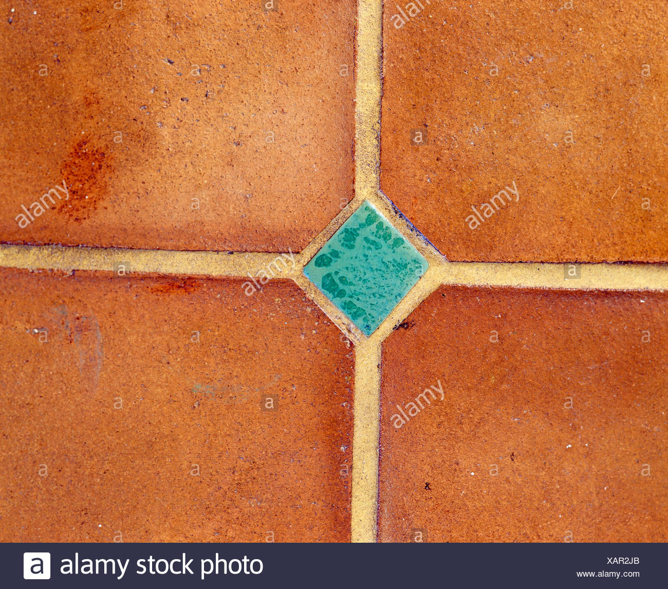 Close Up Of Terracotta Floor Tiles With Turquoise Insert Stock Photo Alamy