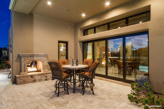 Outdoor Fireplace Herringbone Travertine Floors Transitional
