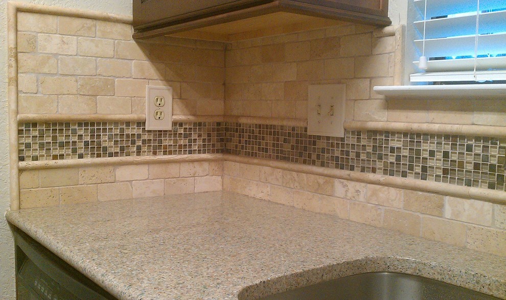 Time Lapse Travertine Subway Tile Backsplash With A Mosaic Glass