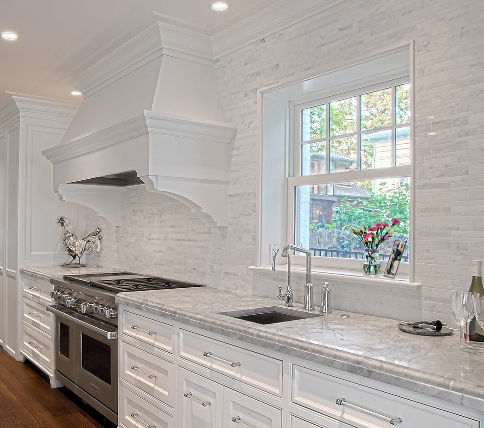 French Range Hood With White Stone Backsplash Tiles Cottage
